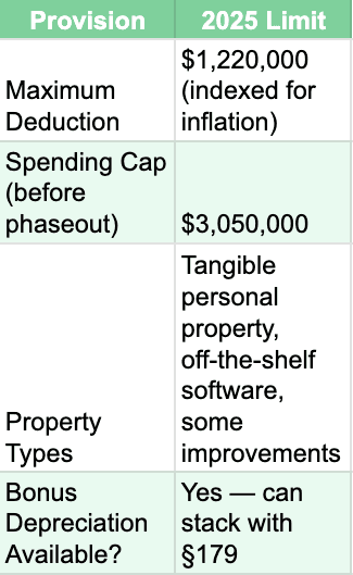 Section 179 allows businesses to immediately deduct the full cost of qualifying equipment and property up to a limit, rather than depreciating it over time. It’s been around longer than bonus depreciation and was originally targeted at helping small businesses reinvest and grow.